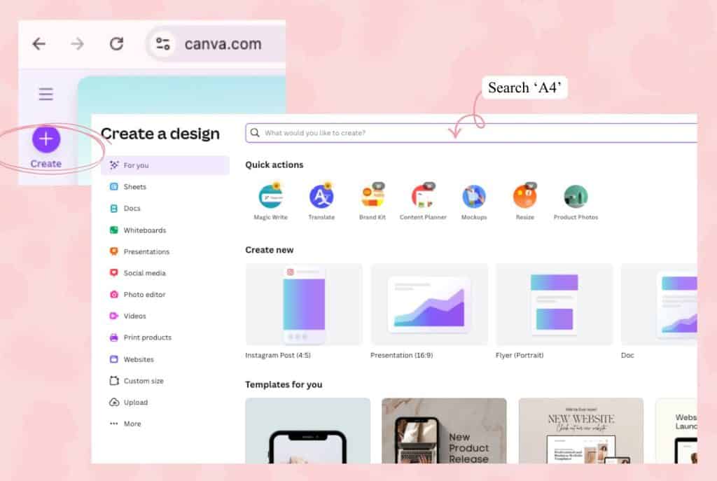 Once you’re in, hit the Create a design button in the top right corner and search A4.